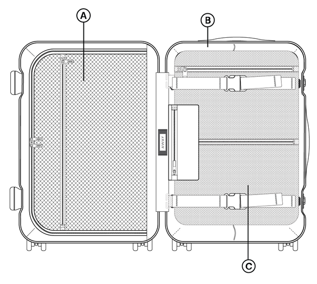 This side’s perfect for clothing and anything else that’s soft and easy to press down. Pile up your clothes, buckle the compression pad, and tighten the straps to pack it all in. Use our Insider Packing Cubes (not included) to stay organized and save even more space. There’s also a mesh pocket on the compression pad Ⓒ for laptops, tablets, or magazines. Unzip the bottom compartment of the compression pad and voilà: a removable laundry bag.