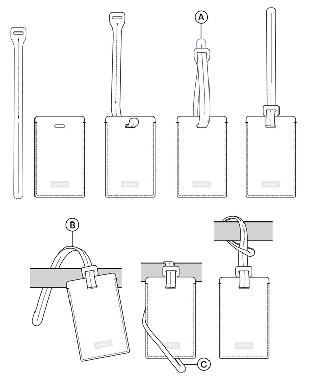 - Slide the Tag through the long slotted end of the strap Ⓒ, in order to secure the Tag to the bag.