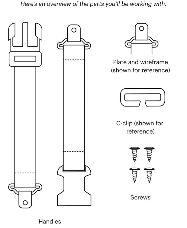 - Unscrew the D-shaped wireframe that holds the strap to the luggage and the plate that sits under the screw.