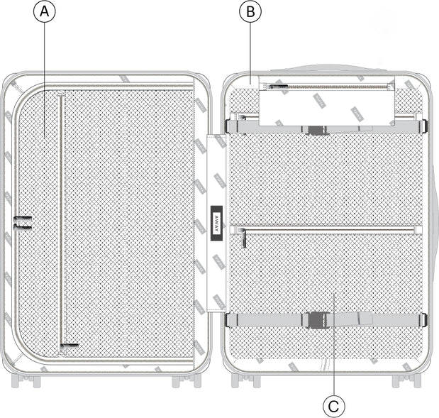 This side’s perfect for clothing and anything else that’s soft and easy to press down. Pile up your clothes, buckle the compression pad, and tighten the straps to pack it all in. Use our Insider Packing Cubes (not included) to stay organized and save even more space. There’s also a mesh pocket on the compression pad Ⓒ for laptops, tablets, or magazines. Unzip the bottom compartment of the compression pad and voilà: a removable laundry bag.