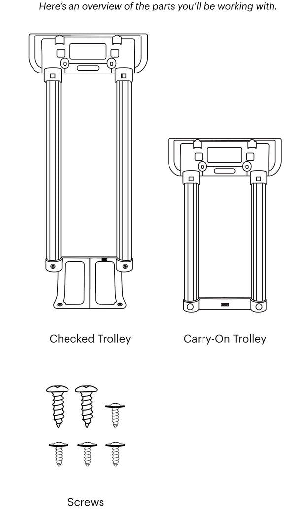 - The trolley is attached to an inner reinforcement at the top and a brace at the bottom. Once the screws are removed, pull the metal trolley poles out of their plastic brace at the bottom of your suitcase and pull the trolley out by the exterior handle.