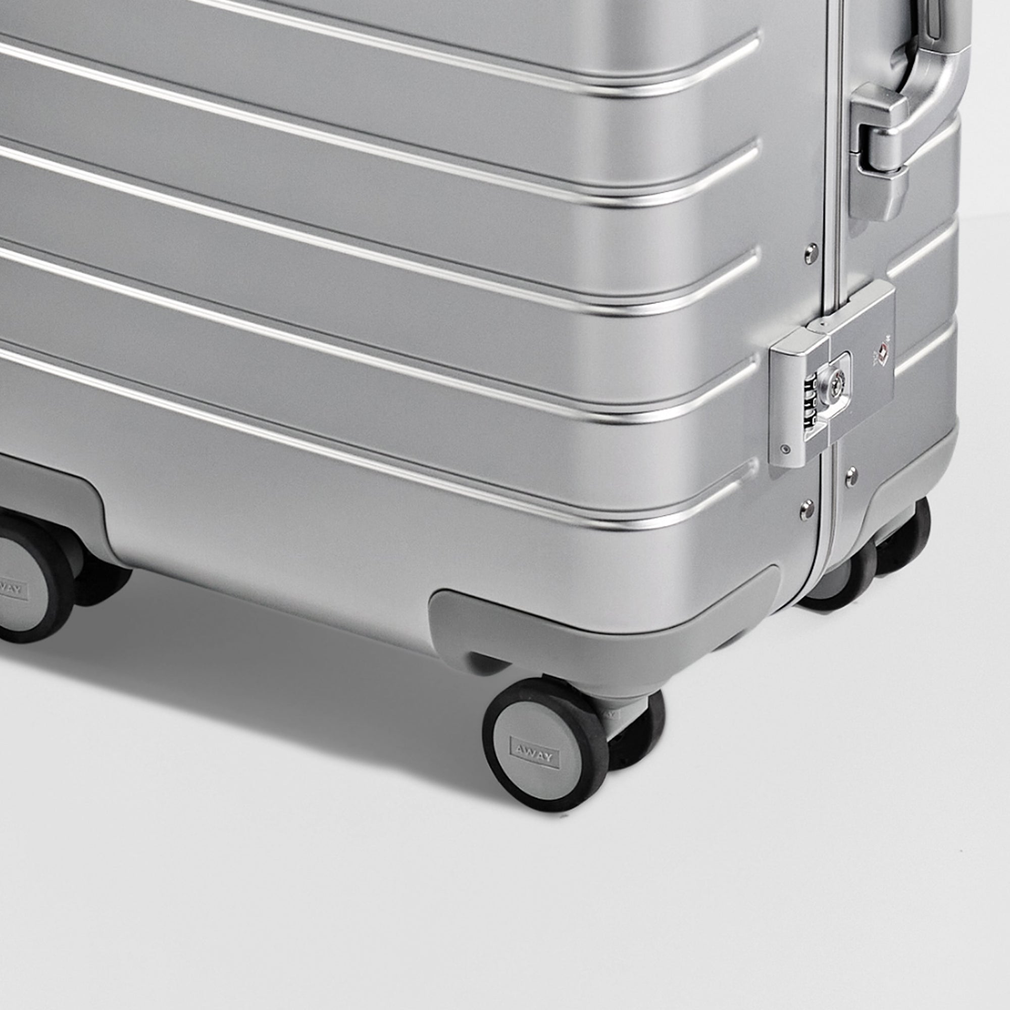 Our Aluminum Large suitcase—the biggest we offer—takes checked luggage to the next level. Its striking aluminum hard shell is tough enough to handle the wear and tear of baggage handlers, and its 360° spinner wheels can speed smoothly across airports, train platforms, and cobblestoned streets.