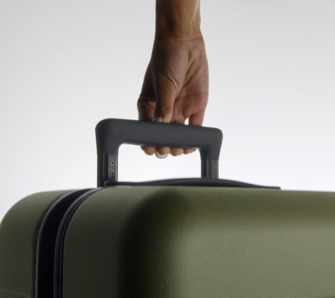 All of our suitcases come with a leather luggage tag. Add up to three letters to personalize yours and stand out at the baggage claim. The Bigger Carry-On suitcase in Jet Black shown shown from above highlighting TSA-approved combination lock and recycled leather luggage tag All of our suitcases come with a leather luggage tag. Add up to three letters to personalize yours and stand out at the baggage claim.