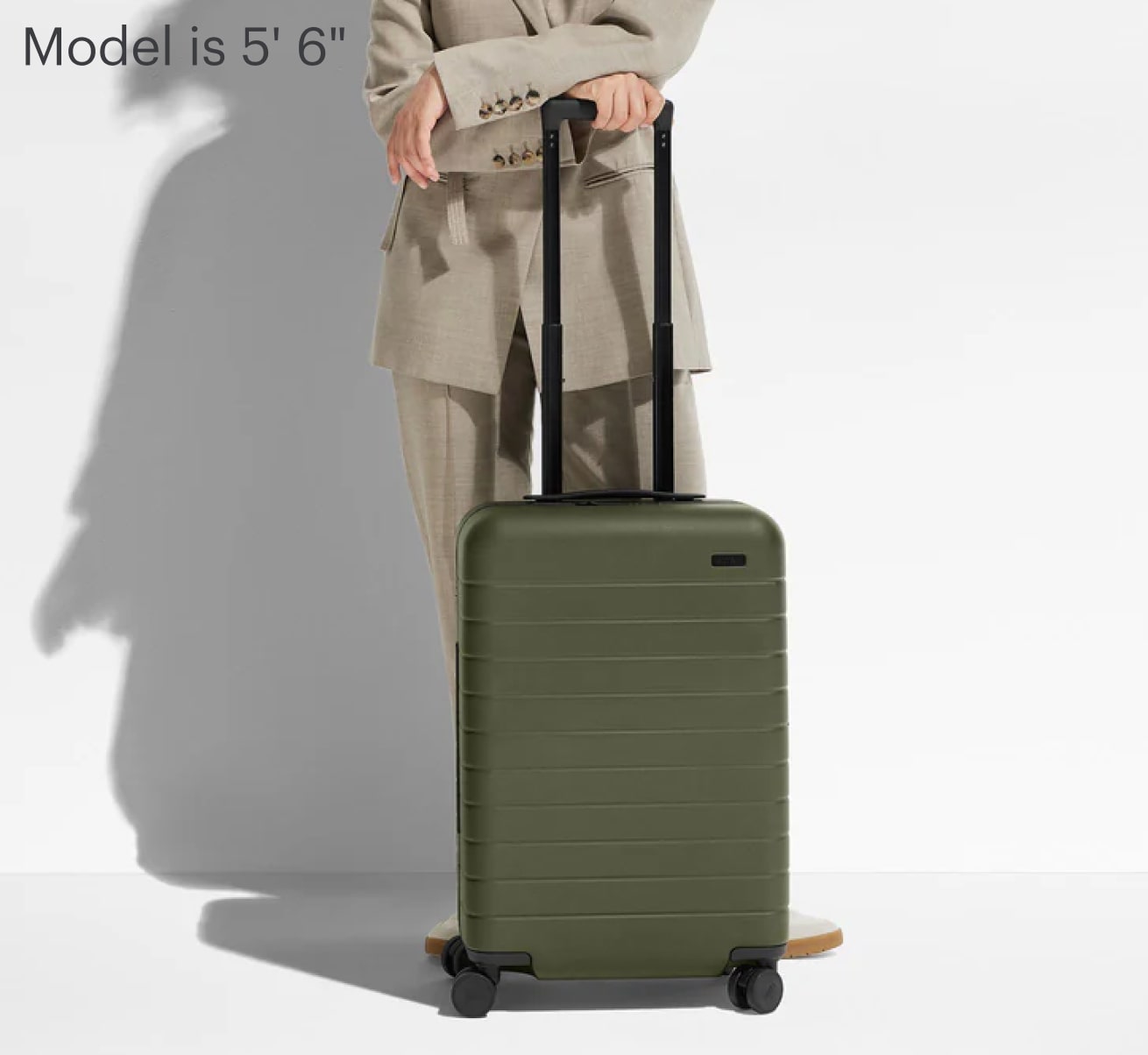 A 5 A 5'6" female model is standing next to The Bigger Carry-On suitcase and leaning her arms on the raised handle to show size and scale Model is 5'6"